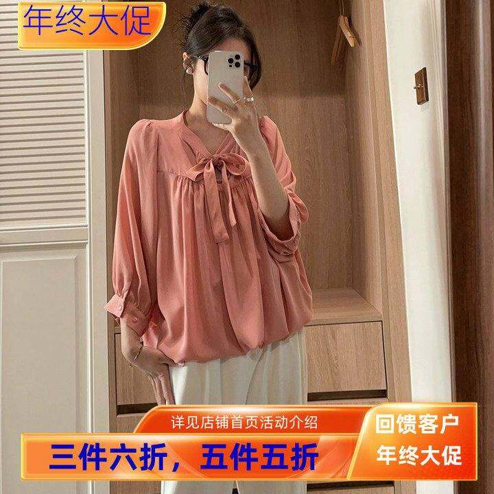 日单高端森系设计感nor前后两穿褶皱系带圆领v领长袖雪纺上衣衬衫