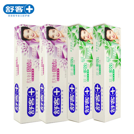 舒客 防蛀固齿牙膏140g*2支+草本多效美白牙膏105g*2支,有效分解牙釉质表面的各类顽渍、深入去除齿体邻面色素,预防牙渍生成,超细研磨体不损伤牙面光泽和釉质,清除口腔内残留食物引起的口臭,美白牙齿去烟渍。