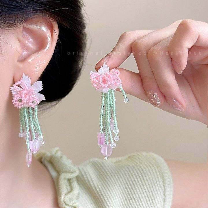 早春色调!小花朵流苏串珠耳钉女仙气海边度假森系耳环方圆脸耳饰