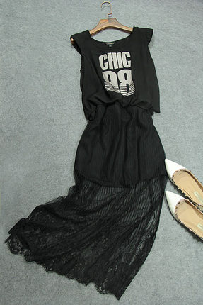 拉*夏~家蕾丝连衣裙休闲显瘦镂空蕾丝连衣裙中长款夏短袖长裙黑色