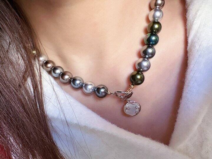 昨天那条人造金珠已出,再挂一条混彩大溪地,也是人造珍珠,但是真的做出来了大溪地珍珠那种油润的珠光。