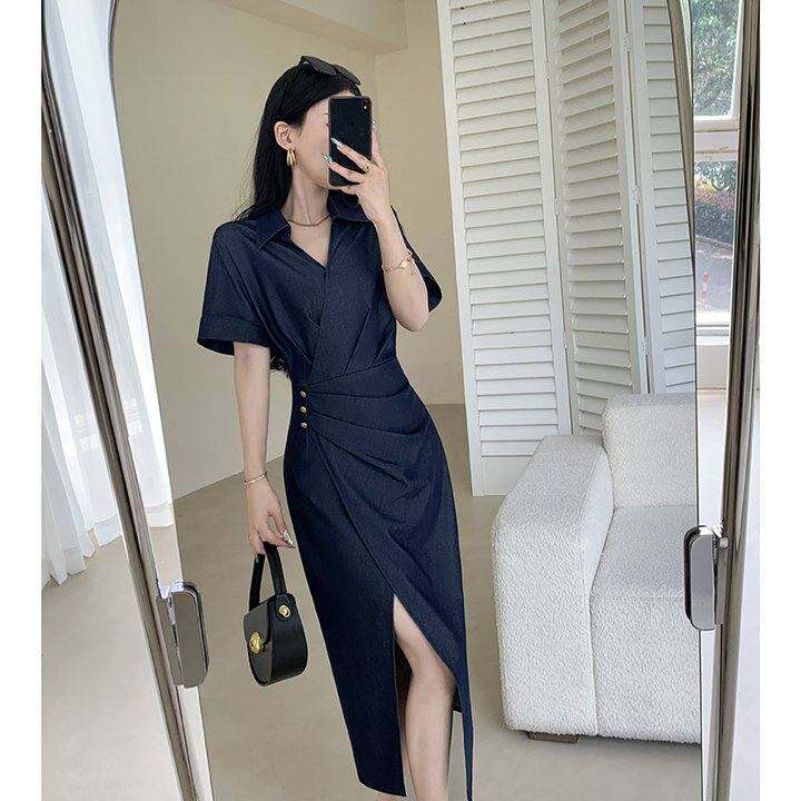 果哥家仿牛仔连衣裙2024夏新款高级感收腰显瘦气质女神范通勤长裙