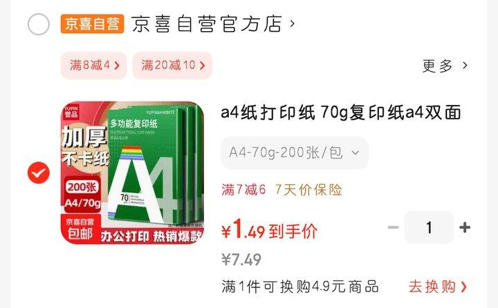 [闪耀]a4纸打印纸 70g学生考研草稿纸白纸 A4-70g-200张/包