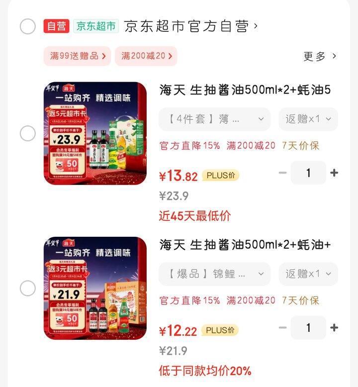 [闪耀]海天 生抽酱油500ml*2+蚝油520g+料酒500ml 礼盒系列 薄盐礼盒https://u.jd.com/EGM0Lmy ... 全部信息