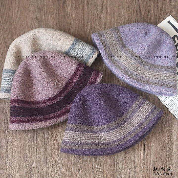 秋冬新款时尚百搭条纹水桶帽羊毛针织保暖圆顶盆帽024