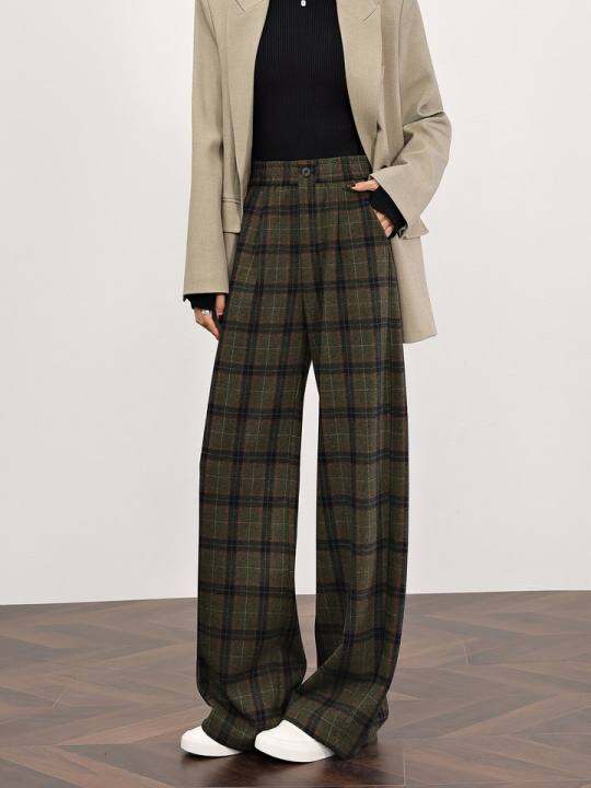 森林绿格子裤女秋冬季2025新款高腰直筒羊毛呢宽松加绒加厚阔腿裤