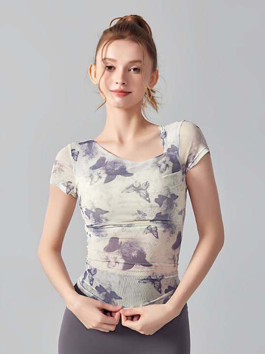 蝴蝶印花瑜伽服短袖一体式胸垫网纱透气速干修身运动健身服上衣女