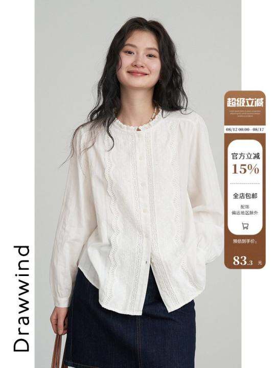 油漆风格Drawwind2025秋季新款长袖衬衫女士宽松提花织物镶边圆领上衣
