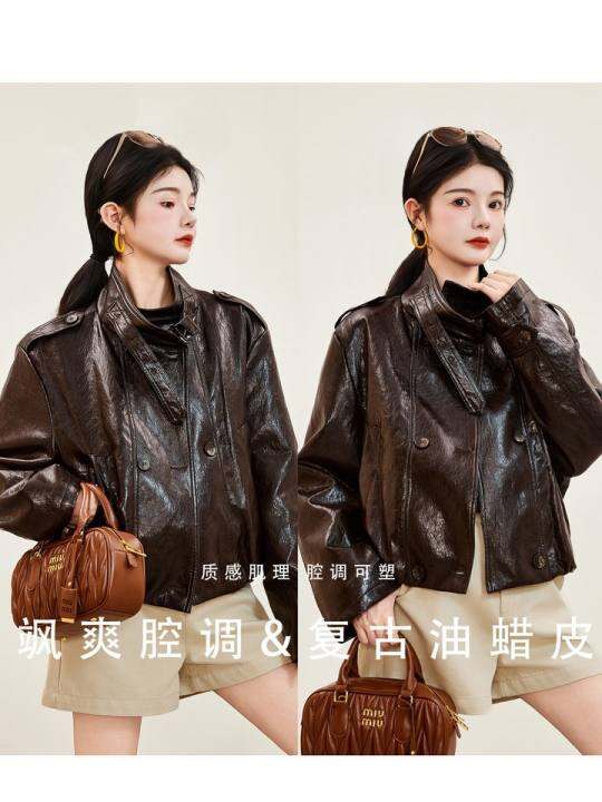 高级感复古立领油蜡皮双排扣皮衣外套女秋季宽松时髦机车服短夹克