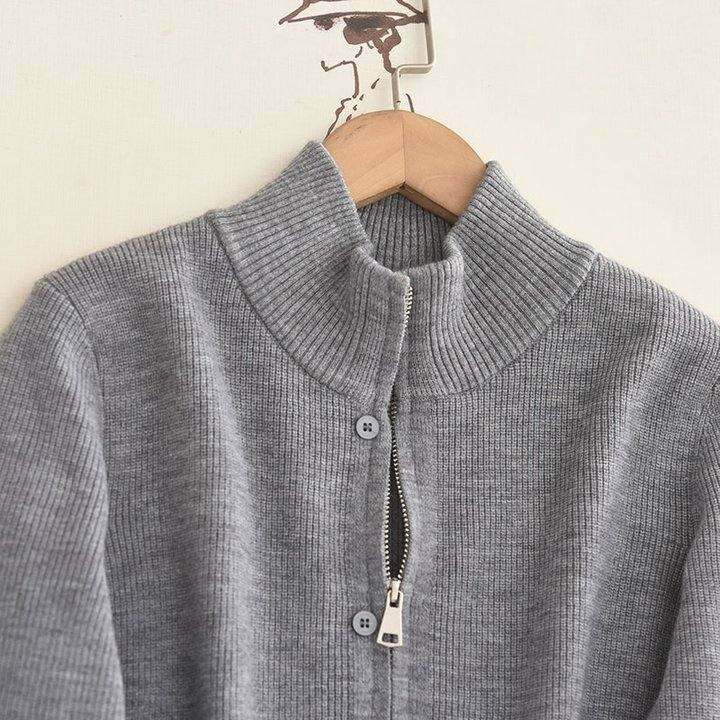 彩系の2025秋新款气质立领显瘦百搭双拉炼针织开衫灰色毛衣 女