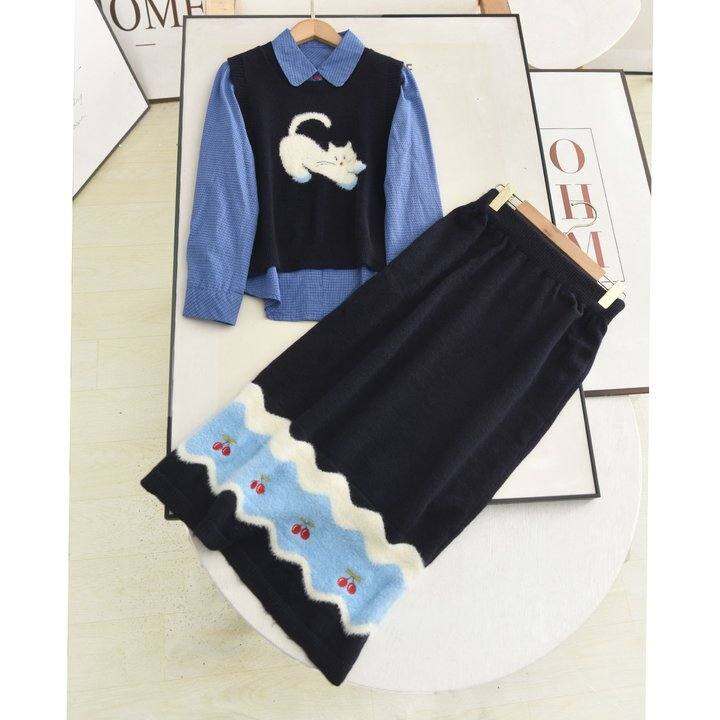 国内Dの2025秋新款法式猫咪提花针织马甲衬衫半身裙三件套装