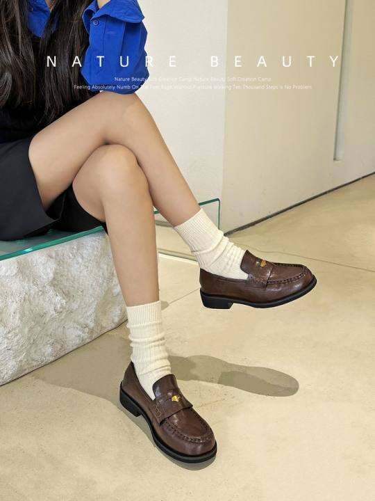 自然卷真皮金币懒人乐福鞋女复古气质通勤秋冬新款英伦方跟小皮鞋