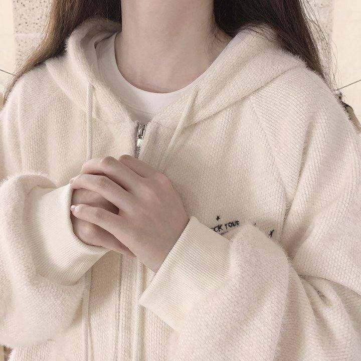 毛绒感 炸毛黑猫刺绣 覆古猫耳 米黄色 插肩袖 宽松连帽外套 H