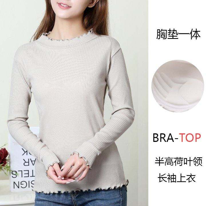 纯棉半高领带胸垫长袖T恤女胸垫一体无钢圈木耳边打底衫家居上衣
