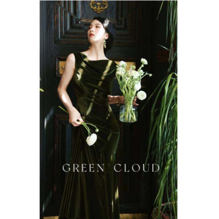 绿色云 灼若芙蕖浪漫优雅女人味垂领收腰复古海藻绿丝绒连衣长裙