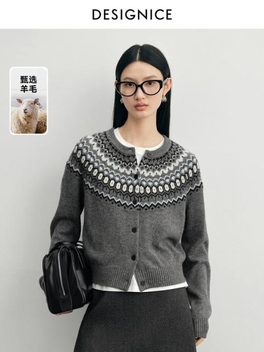 迪赛尼斯费尔岛北欧羊毛针织衫2025冬季新款气质覆古圆领开衫女