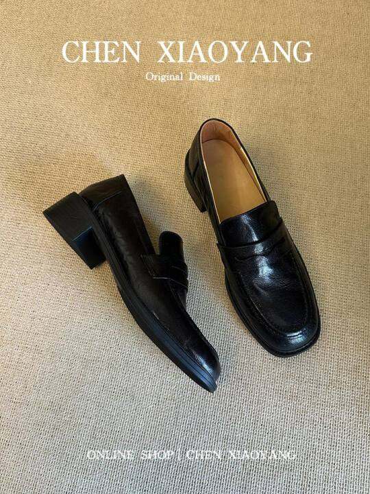 真皮覆古一脚蹬厚底乐福鞋女圆头简约百搭黑色深口单鞋通勤工作鞋