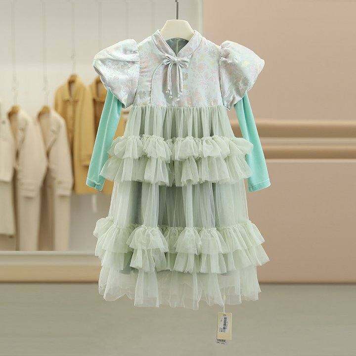 童装~专柜价539【古】新中式国风碎花假两件网纱拼接大童洋装女
