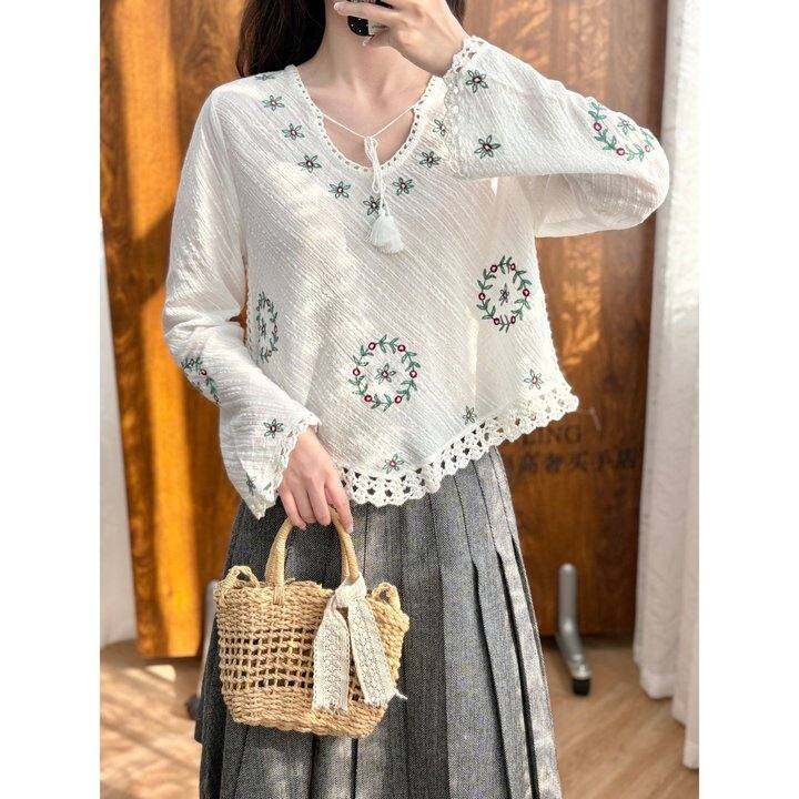 波西米亚田园风26新款碎花刺绣肌理感透气棉系带U领长袖衬衫上衣