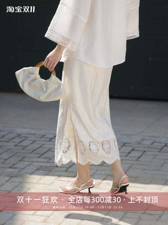 芝美日禾 层次感镂空特种绣弹力松紧腰侧开衩中长款半身裙