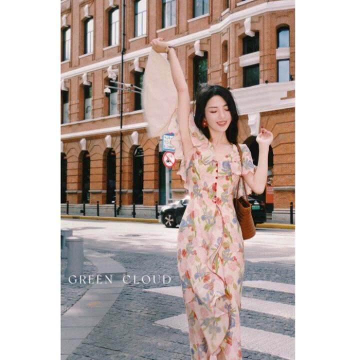 绿色云 芙罗拉 浪漫优雅覆古法式收腰包臀荷叶摆斗篷领碎花洋装