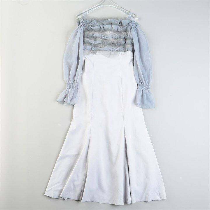 日单一字肩吊带鱼尾连衣裙女86150雪纺网纱高腰A字气质荷叶边长裙