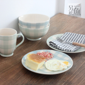 优雅的格子系列餐具(请忽略那只没煎好的蛋)。路口9折价。优惠只给来自路口的娃。拍下留言改价。限9月10日前。