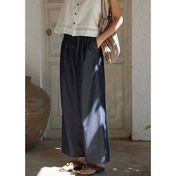 「MISAZ」 轻盈仿牛仔 舒适松紧腰阔腿裤 薄款休闲高腰直筒裤