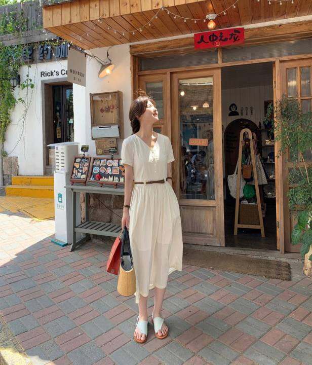 AHUI 夏季新款v领衬衣连衣裙收腰系带短袖通勤显瘦长裙
