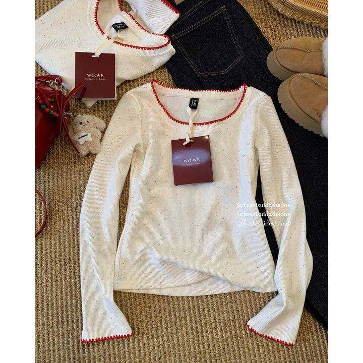 @wgw*原 配色很好看~韩系撞色点点正肩u领修身打底衫上衣