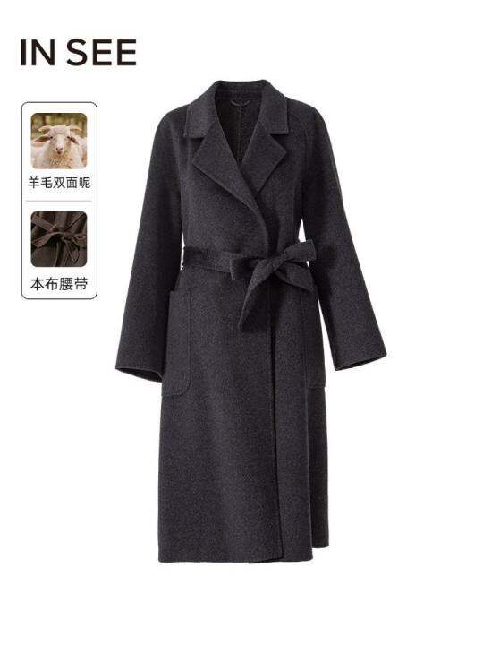 IN SEE赫本风双面呢大衣女中长款2025秋新款系带收腰高端羊毛外套