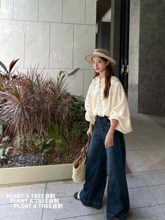 不贴腿水洗复古蓝色牛仔裤女2025年早秋弹力微喇叭拖地阔腿裤长裤