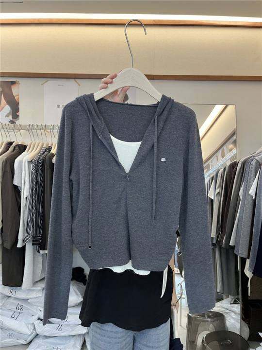25韩国东大门linai早秋新品拉链连帽假两件套针织衫毛衣套头上衣