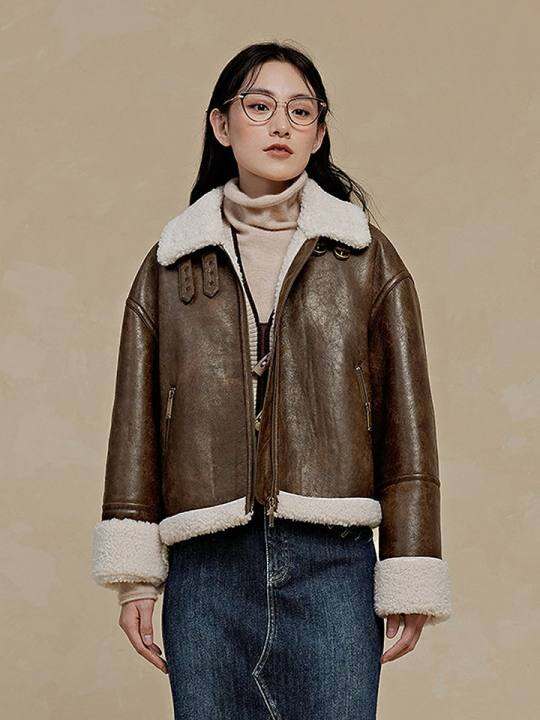 PIT覆古咖色皮质短外套女2025秋季新款羊羔毛上衣百搭小个子