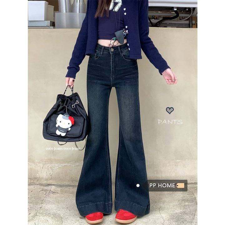 PPHOME水洗蓝复古微喇牛仔裤女秋冬小个子高腰直筒马蹄裤拖地长裤