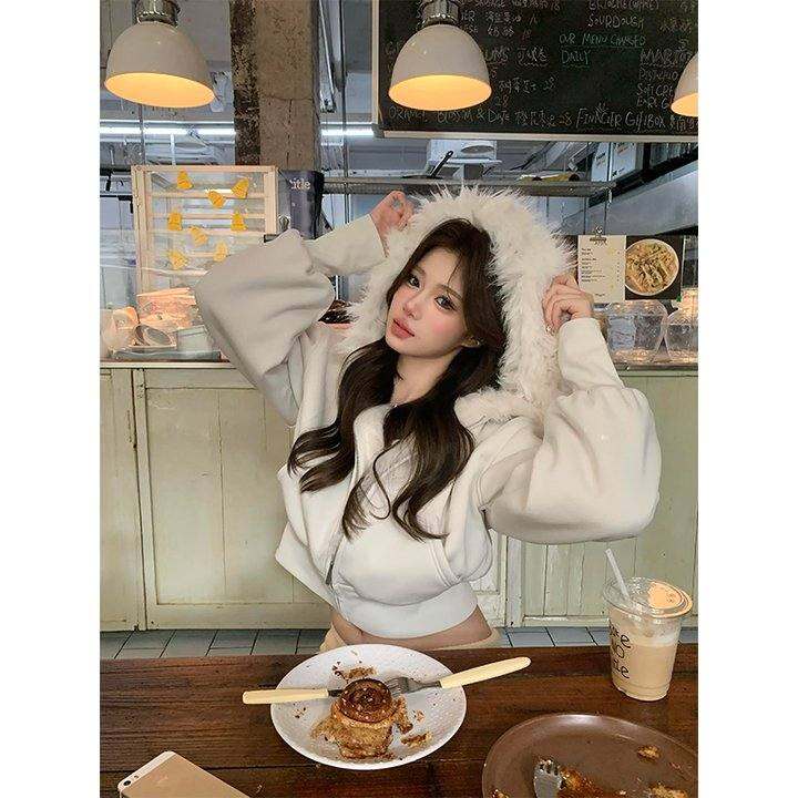 美式复古加绒加厚毛领连帽卫衣外套女装冬季白色毛绒内胆短款上衣