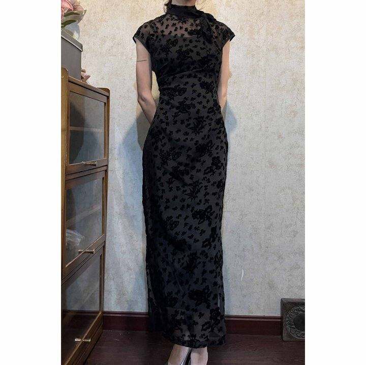 现货LimpOnline|小黑花烂花丝绒系带新中式褶皱设计旗袍连衣裙