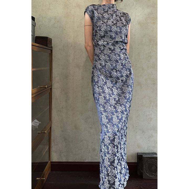现货Limponline|原创提花系扣新中式蓝碎花褶皱连衣裙旗袍