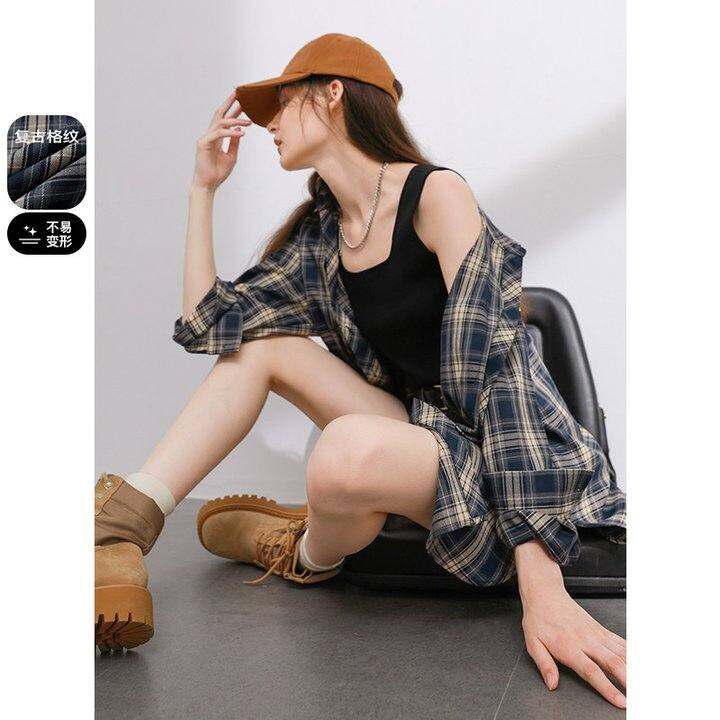 三彩2025夏季新款雅痞风衬衫宽松防晒翻领格子衬衣格纹上衣轻薄女