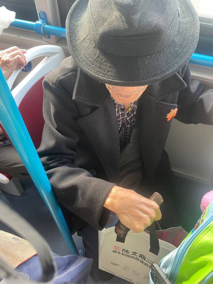 坐公车,遇到一个很讲究的老爷爷,黑大衣上别着漂亮的红叶胸针