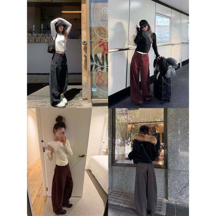 Xzz charmingl 三色磨毛酵洗口袋工装裤女秋冬新款宽松休闲阔腿裤