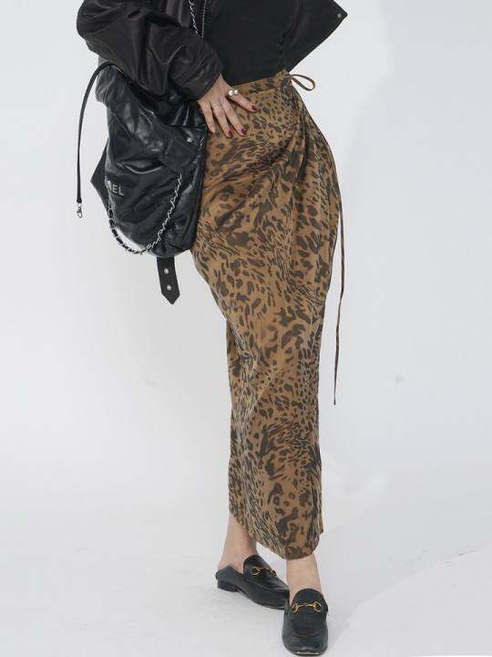 Akimbo ● 一片式褶皱系带包臀半裙 豹纹长款半身裙 覆古时髦精