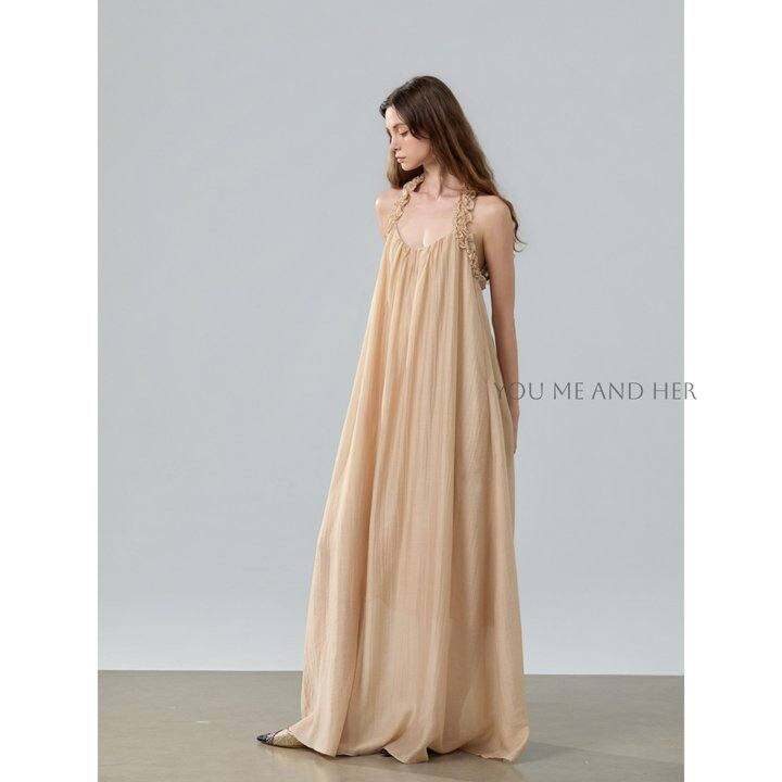 YOU ME AND HER原创设计希腊风浪漫花边吊带裙女露肩度假风连衣裙