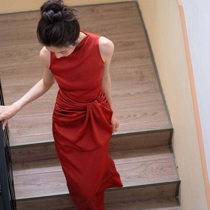 DUCHUNZI 欧尼挂颈显瘦削肩洋装气质收腰百褶高级感无袖裙子 女