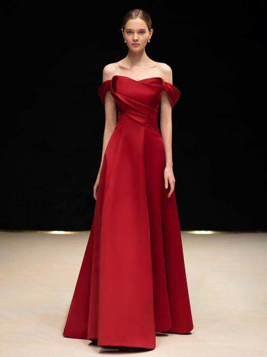 缎面敬酒服新娘红色气质高级感结婚订婚礼服裙一字肩艺考成人礼女