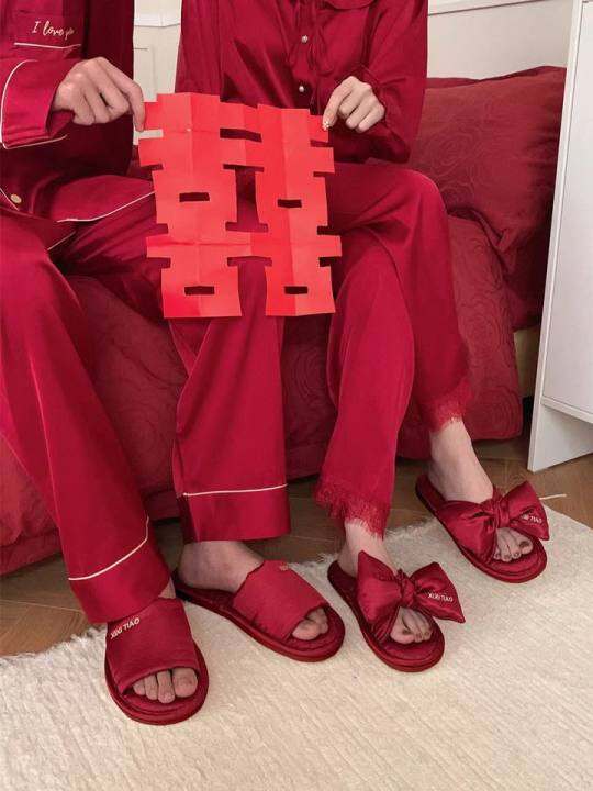 细细条 蝴蝶结结婚喜庆红色拖鞋男女休闲四季通用情侣棉麻拖鞋ins