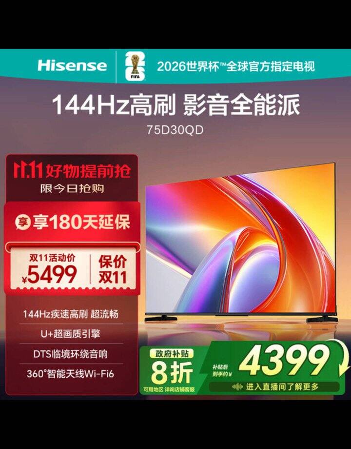 海信电视D30QD 75英寸 144Hz高刷 U+超画质 DTS环绕音响,部分地区有国补,2986.6