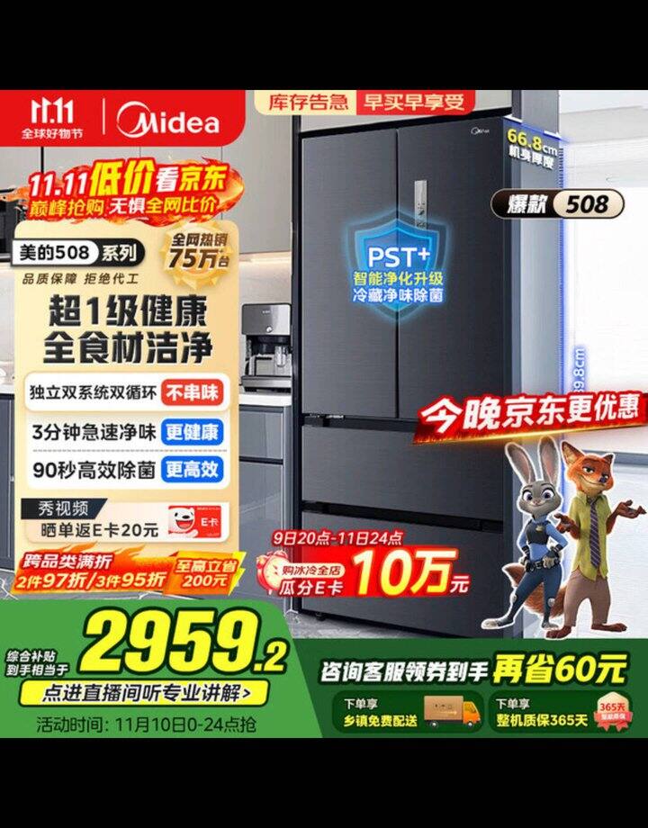 【京东】美的(Midea)508升法式多门四开门双系统冰箱,部分国补后【2098】