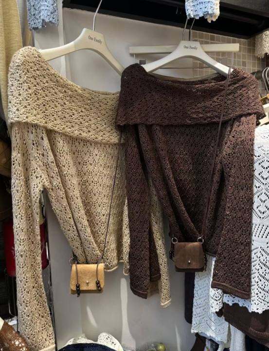 韩系温柔风一字肩长袖针织衫女2025春季新款设计感小众别致上衣