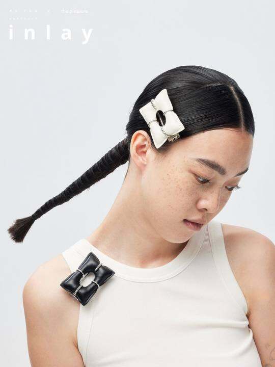 吾也联名金属发夹银色皮质枕头发抓 时尚合金边夹设计